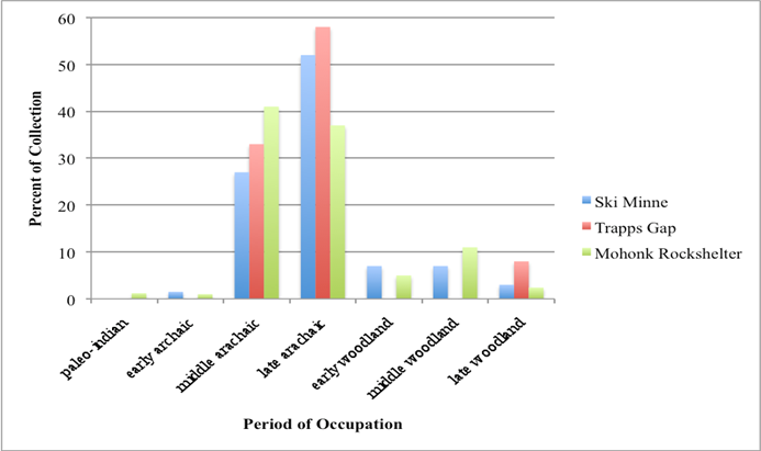 Our research at the Ski Minne Rockshelter, excavated by Eisenberg and his students and reanalyzed and published by my group, supports this model of use. Additionally, a comparison of the materials from the three shelters confirms use of the ridge primarily during the Archaic Period, with a significant decrease in diagnostic projectile points in the subsequent Woodland Period.